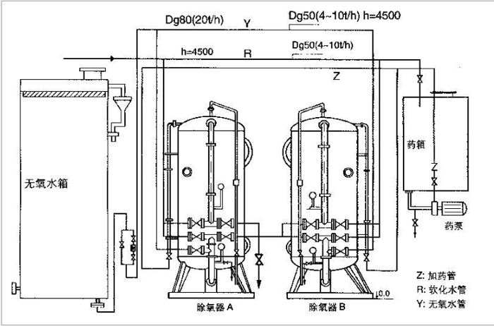 氧化還原樹脂除氧器是一種新型的除氧器,它是利用亞硫酸鈉的可氧化性能,使亞硫酸鈉和水中的氧氣在樹脂上發生反應,生成硫酸型樹脂,然后在利用亞硫酸鈉進行還原,恢復其在氧化功能。除氧水箱應與空氣隔絕,可以設單罐或雙罐,都能保證連續供應脫氧水。