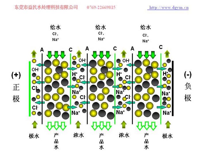 帶負電荷的陰離子(例如OH-、Cl-)被正極(+)吸引而通過陰離子交換膜,進入到鄰近的濃水室。此后這些離子在繼續向正極遷移中遇到鄰近的陽離子交換膜,而陽離子交換膜不允許陰離子通過,這些離子即被阻隔在濃水中。淡水流中的陽離子(例如Na+ 、H+)以類似的方式被阻隔在濃水室。在濃水室,透過陰陽膜的離子維持電中性。離子交換膜和離子交換樹脂的工作原理相近,可以選擇性地透過離子,其中陰離子交換膜只允許陰離子透過,不允許陽離子透過;而陽離子交換膜只允許陽離子透過,不允許陰離子透過。在一對陰陽離子交換膜之間充填混合離子交換樹脂就形成了一個EDI單元。陰陽離子交換膜之間由混合離子交換樹脂占據的空間被稱為淡水室。將一定數量的EDI單元羅列在一起,使陰離子交換膜和陽離子交換膜交替排列,在離子交換膜之間添加特殊的離子交換樹脂,其形成的空間被稱為濃水室。在給定的直流電壓的推動下,在淡水室中,離子交換樹脂中的陰陽離子分別向正、負極遷移,并透過陰陽離子交換膜進入濃水室,同時給水中的離子被離子交換樹脂吸附而占據由于離子電遷移而留下的空位。事實上離子的遷移和吸附是同時并連續發生的。通過這樣的過程,給水中的離子穿過離子交換膜進入到濃水室被去除而成為除鹽水。