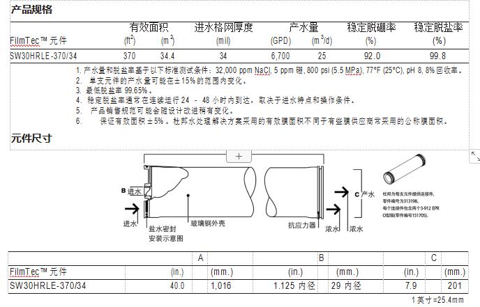 FilmTec™ SW30HRLE-370/34 元件是一款高耐久性、高脫除率、高產水量海水膜元件, 用于高污染或挑戰性水源的情況,有助于系統的穩定運行和產水成本的降低。