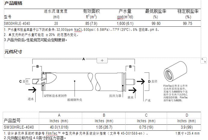 • SW30HRLE-4040 可作為試驗用海水淡化膜元件,用于示范了解設(shè)計更大系統(tǒng) 的運行性能。