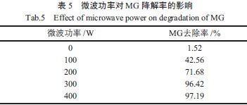 微波功率對MG 降解的影響如表5 所示。由表5 可知,當(dāng)沒有微波作用時(shí),孔雀石綠的降解率僅為1.52%,顯然,沒有微波介入的其他途徑對孔雀石綠降解的影響較為有限。微波功率為100 W時(shí),MG 降解率提高至40%以上,降解效果比較明顯。當(dāng)微波功率增加到300 W 時(shí),孔雀石綠降解率達(dá)到96.42%,繼續(xù)增加微波功率,降解率變化不大,這是由于,微波功率較低時(shí),隨著微波功率的增大,高強(qiáng)度的微波能加劇反應(yīng)物MG 分子的熱運(yùn)動(dòng),削弱分子內(nèi)原子間鍵能,同時(shí)促進(jìn)H2O2催化分解產(chǎn)生·OH,提高孔雀石綠的降解率;微波功率增加到一定程度,高強(qiáng)度的微波能使體系溫度驟然上升,H2O2在較高的溫度下易分解生成氧氣和水,故孔雀石綠的降解率變化不大。根據(jù)試驗(yàn)結(jié)果,適宜的微波功率為300 W。