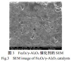 分析催化劑EDS 結(jié)果可知,催化劑表面主要是由氧、鋁、鐵3 種元素構(gòu)成,因此可以得到催化劑為Fe2O3/γ-Al2O3催化劑。Fe2O3/γ-Al2O3催化劑的SEM如圖3 所示,由圖3 可知,催化劑表面的Fe2O3晶體顆粒較小,且分布均勻。這是因?yàn)槌曒椛渲饕从诼暱栈瘷C(jī)制,空化過程中產(chǎn)生的局部高壓和高溫可使液體中產(chǎn)生強(qiáng)大的沖擊波或高速射流,并以特殊能量形式加速了溶液中Fe3+ 在γ-Al2O3表面的吸附平衡,同時(shí)可以更高效地利用載體的比表面,使金屬離子在相同的載體上達(dá)到比較大量吸附平衡,從而提高了Fe3+ 在γ-Al2O3上的負(fù)載含量,增強(qiáng)催化劑的催化活性。