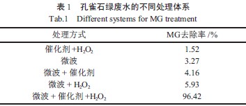 由表1 可知,催化劑+H2O2、微波、微波+ 催化劑、微波+ H2O2體系對孔雀石綠去除率很低,反應(yīng)5min 后去除率比較高僅達(dá)到5.93%。微波+ 催化劑+H2O2體系使孔雀石綠降解達(dá)到了很好的效果,處理5 min 后,孔雀石綠降解率達(dá)到96.42%。