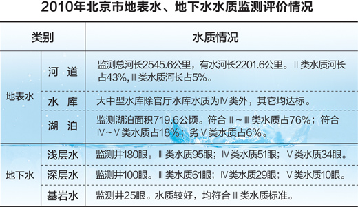 北京水資源主要包括:地下水、地表水、外調水、應急水源。根據國家相關標準,水源地的水質應為Ⅰ、Ⅱ、Ⅲ類水。據了解,密云水庫是目前北京唯一的地表水源地;官廳水庫在1997年就因入庫水量銳減、水環境惡化而退出飲用水源地,只作為京西工業和景觀用水水源。