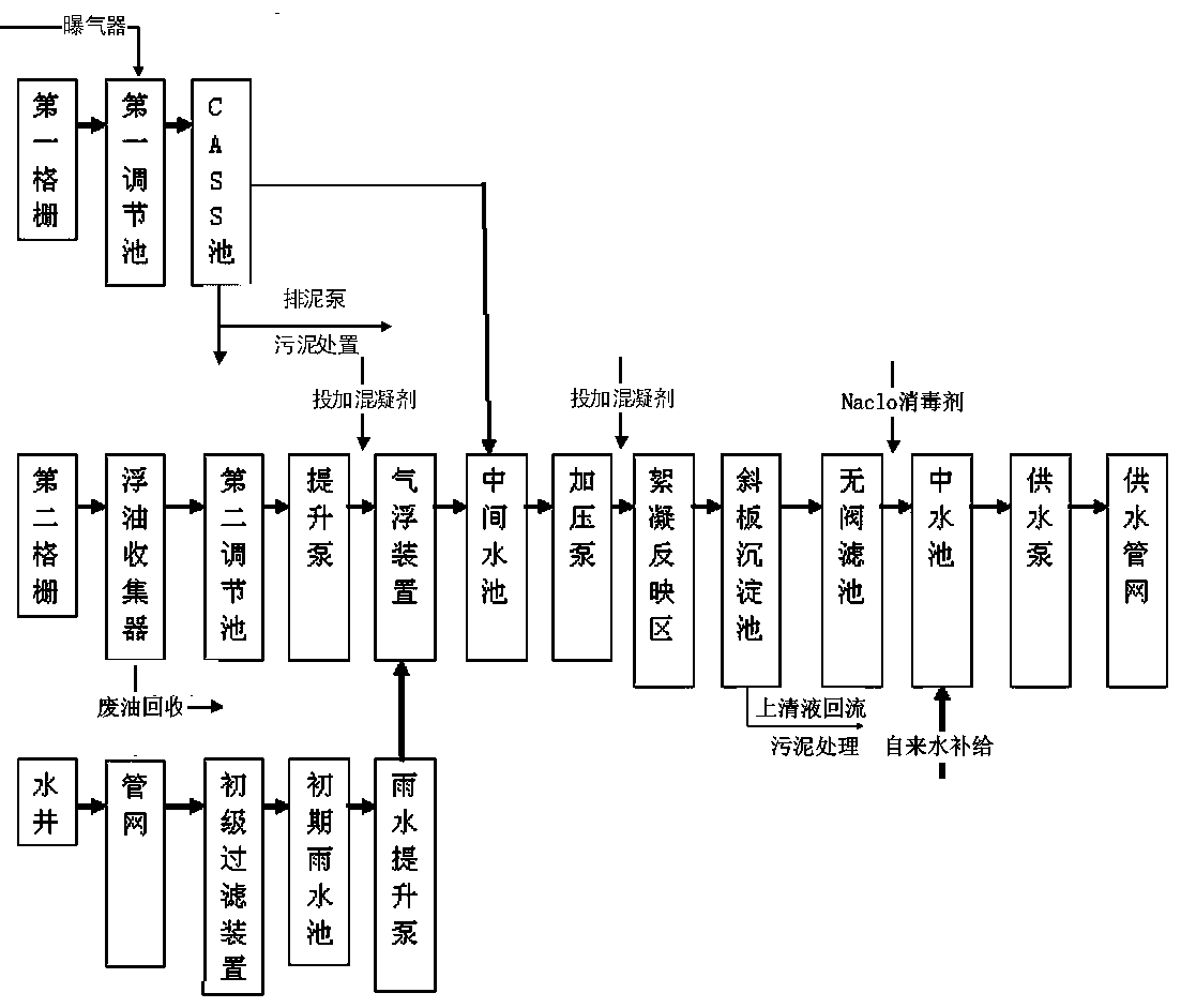 所述的綜合處理系統包括依次設置的中間水池、一體化凈水器以及中水池;所述的中間水池分別與CASS池以及氣浮裝置進行連接。