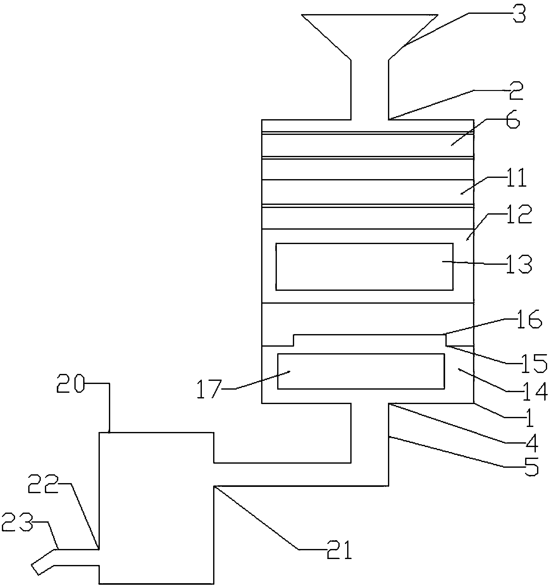 1.一種小型智能污水處理裝置,包括污水處理殼體(1),其特征在于,所述污水處理殼體(1)固定安裝在地面上,所述污水處理殼體(1)頂部中間部位開有污水進水口(2),所述污水進水口(2)上固定安裝有進水漏斗(3),所述污水處理殼體(1)內部設有污水處理核心裝置,所述污水處理核心裝置是由位于污水處理殼體(1)內部自上而下固定連接的一級凈化裝置、二級凈化裝置、三級凈化裝置、水質測量裝置共同構成,所述污水處理殼體(1)底部中間部位開有純凈水出水口(4),所述純凈水出水口(4)上固定安裝有純凈水導管(5),所述純凈水導管(5)的一端與純凈水出水口(4)固定連接,另一端固定連接有純凈水儲存裝置,所述一級凈化裝置是由與污水處理殼體(1)內部四周固定連接的一級凈化盒體(6)、位于一級凈化盒體(6)內部由比較底端直至比較頂端平鋪的小卵石層(7)、石英砂層(8)、活性炭層(9)共同構成,所述每層之間設有孔徑微小細密的鋼絲網(10),所述二級凈化裝置是由與污水處理殼體(1)內部四周和一級凈化盒體(6)底部固定連接的二級凈化盒體(11)、位于二級凈化盒體(11)內部由底端至比較頂端平鋪的活性炭層(9)、石英砂層(8)共同構成,所述每層之間設有孔徑微小細密的鋼絲網(10),所述三級凈化裝置是由與污水處理殼體(1)內部四周和二級凈化盒體(11)底部固定連接的三級凈化盒體(12)、位于三級凈化盒體(12)內部的管式陶瓷膜(13)共同構成,所述水質測量裝置是由與污水處理殼體(1)內部比較底端固定連接的水質測量盒體(14)、開在水質測量盒體(14)頂部中間位置的測量開口(15)、固定安裝在測量開口(15)上的網狀圓片(16)、位于水質測量盒體(14)內部的水質監測器(17)共同構成,所述純凈水出水口(4)上固定安裝有電子開關裝置,所述電子開關裝置是由與純凈水出水口(4)固定連接的開關擋板(18)、位于開關擋板(18)旁邊的微型直線電機(19)共同構成,所述純凈水儲存裝置是由純凈水箱體(20)、開在純凈水箱體(20)一側表面的儲存進水口(21)、開在純凈水箱體(20)另一側表面上的儲存水出水口(22)、固定安裝在儲存水出水口(22)上的水龍頭(23)共同構成,所述污水處理殼體(1)側表面上設有控制器(24),所述控制器(24)與水質監測器(17)、微型直線電機(19)相連接。