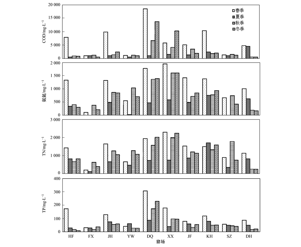 圖 1 春夏秋冬4次采樣中10家規模化豬場COD、 氨氮、 TN和TP的濃度變化情況