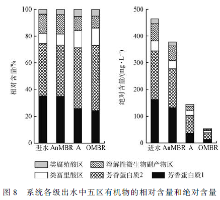 通過積分各區的熒光強度,計算得到各樣品五區有機物的相對含量,乘以各樣品TOC 濃度得到其絕對含量,如圖8 所示。結果表明,進水中Ⅰ、Ⅱ區的芳香族蛋白質類似物和Ⅳ區溶解性微生物副產物的總和所占比例達88. 5% ,系統處理出水中Ⅱ區芳香族蛋白質類似物占40% ,表明Ⅱ區芳香族蛋白質類似物較難降解,與相關研究報道相符。