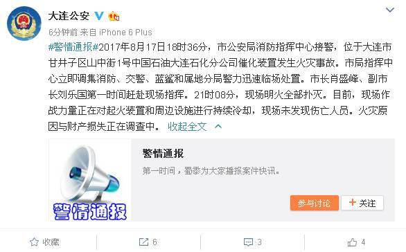 昨晚21:54,大連公安發布警情通報,證實中石油大連分公司發生火災事故。