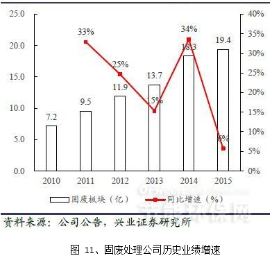 固廢處理:1)垃圾焚燒行業(yè)整體進(jìn)入運(yùn)營(yíng)期:2014 年全國(guó)垃圾焚燒處理能力增長(zhǎng)達(dá)到13%,相比于此前25%的5 年復(fù)合增長(zhǎng)率出現(xiàn)明顯下滑。從行業(yè)長(zhǎng)期發(fā)展邏輯看,原有填埋場(chǎng)容量趨于飽和,地價(jià)上漲降低政府新建填埋場(chǎng)的驅(qū)動(dòng)力,未來(lái)焚燒占比將逐年上升。過(guò)去幾年是垃圾焚燒項(xiàng)目的建設(shè)高峰期,企業(yè)跑馬圈地,考驗(yàn)的是企業(yè)的拿單能力。目前垃圾焚燒產(chǎn)業(yè)從建設(shè)期逐漸步入運(yùn)營(yíng)期,對(duì)企業(yè)的運(yùn)營(yíng)能力、項(xiàng)目選擇能力、成本控制能力提出了更高的要求。2)看好工業(yè)固廢處理:2013 年,一般工業(yè)固廢、工業(yè)危險(xiǎn)廢物處臵利用率分別達(dá)到87.2%、74.8%,均低于生活垃圾無(wú)害化處理率89.3%。從實(shí)際經(jīng)驗(yàn)來(lái)看,大量工業(yè)固廢由于監(jiān)管不嚴(yán)(例如靖江市侯河石油化工廠長(zhǎng)期、大量非法填埋危險(xiǎn)廢物等),并未納入統(tǒng)計(jì)范圍,實(shí)際工業(yè)危廢處理率可能低于環(huán)保部的統(tǒng)計(jì)數(shù)字。3)板塊增速:13、14、15 年扣非業(yè)績(jī)同比增長(zhǎng)15%、34%、6%。生活垃圾焚燒行業(yè)整體增速下行。