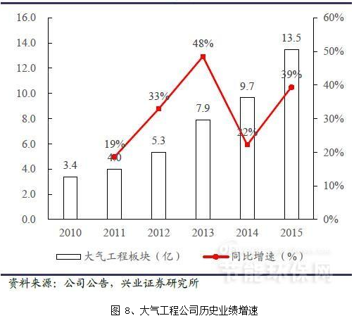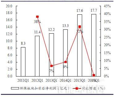 :1)板塊增速:2006~2008 年脫硫機(jī)組上量高峰;2012~2014 年脫硝機(jī)組上量高峰。14 年底脫硫機(jī)組占全國(guó)現(xiàn)役燃煤機(jī)組容量的92.1%,脫硝機(jī)組占比83.2%。從板塊扣非業(yè)績(jī)?cè)鏊賮?lái)看,15 年全年增速為39%,主要原因是行業(yè)龍頭龍凈環(huán)保、清新環(huán)境保持較快增長(zhǎng)。16 年一季度扣非業(yè)績(jī)?cè)鏊贋?%。2)展望:我們認(rèn)為脫硫脫硝同比增速的高點(diǎn)在14 年已經(jīng)過(guò)去,長(zhǎng)期的大邏輯已經(jīng)打破。我們認(rèn)為脫硫脫硝工程上市公司業(yè)績(jī)?nèi)阅鼙3忠粋(gè)較為平穩(wěn)的增速,主要原因是一些脫硫脫硝公司轉(zhuǎn)變盈利模式,從單一的工程類公司轉(zhuǎn)向脫硫脫硝運(yùn)營(yíng),以及涉足超凈排放等新環(huán)保業(yè)務(wù)。VOCs 是空氣污染重要來(lái)源之一,將是未來(lái)大氣綜合治理關(guān)鍵。目前伴隨石油化工、包裝印刷行業(yè)開(kāi)展VOCs 排污費(fèi)試點(diǎn)征收,我們判斷VOCs 治理序幕已揭開(kāi)。