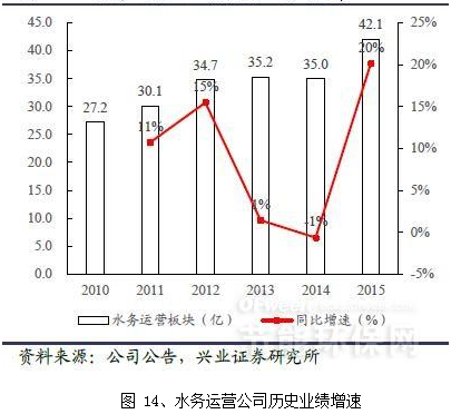 水務(wù)運(yùn)營(yíng)板塊13、14、15 年扣非業(yè)績(jī)同比增長(zhǎng)1%、-1%、20%(個(gè)股中山公用投資收益問(wèn)題致行業(yè)增速偏高,若剔除此影響,15 年扣非增速0.2%)。水務(wù)運(yùn)營(yíng)公用事業(yè)屬性明顯,水處理工程業(yè)績(jī)彈性明顯大于水務(wù)運(yùn)營(yíng)。