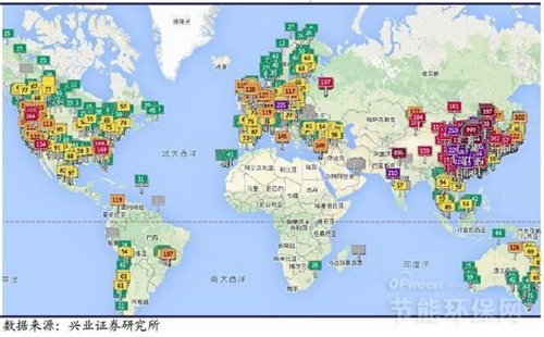 但是無(wú)論從直觀還是數(shù)據(jù)上,空氣質(zhì)量并無(wú)明顯改善。從直觀感受來(lái)看,今年冬季霧霾非常嚴(yán)重,以華北地區(qū)尤甚。從數(shù)據(jù)來(lái)看,重點(diǎn)城市2014 年、2015 年空氣質(zhì)量綜合指數(shù)相對(duì)2013 年有所惡化;中國(guó)的空氣質(zhì)量指數(shù)明顯比國(guó)外惡劣。
