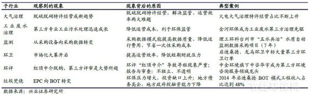 環(huán)保2.0時(shí)代:從工程到運(yùn)營(yíng)來(lái)臨;六個(gè)子行業(yè)中觀察到的現(xiàn)象:1)大氣治理:脫硫脫硝特許經(jīng)營(yíng)(BOT)成新趨勢(shì),火電脫硫脫硝特許經(jīng)營(yíng)占比不斷上升。2)工業(yè)廢水治理:第三方專業(yè)工業(yè)污水處理迅速成長(zhǎng)。3)監(jiān)測(cè):監(jiān)測(cè)行業(yè)業(yè)主方從采購(gòu)設(shè)備向采購(gòu)數(shù)據(jù)轉(zhuǎn)變;相應(yīng)的,監(jiān)測(cè)公司從設(shè)備供應(yīng)商向服務(wù)&運(yùn)營(yíng)供應(yīng)商轉(zhuǎn)型。4)環(huán)衛(wèi):市場(chǎng)化大幕開(kāi)啟,第三方環(huán)衛(wèi)公司承擔(dān)運(yùn)營(yíng)業(yè)務(wù)。5)環(huán)評(píng):紅頂中介脫鉤,第三方評(píng)審是大勢(shì)所趨。6)垃圾焚燒:垃圾焚燒公司獲得的訂單從EPC模式向BOT模式轉(zhuǎn)變。