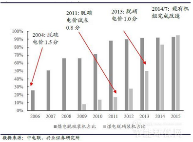 .補(bǔ)貼電價(jià)+排污費(fèi)+排放標(biāo)準(zhǔn).三重政策驅(qū)動(dòng)下,火電脫硫脫硝接近完成。1)政策驅(qū)動(dòng):2004年脫硫補(bǔ)貼電價(jià)1.5分/度出臺(tái)。2011年脫硝電價(jià)試點(diǎn)0.8分/度出臺(tái)。2013年脫硝電價(jià)1.0分/度出臺(tái)。2014年7月前,排放標(biāo)準(zhǔn)要求現(xiàn)有火電機(jī)組要求完成脫硫脫硝改造。2015年6月前,二氧化硫和氮氧化物排污費(fèi)征收標(biāo)準(zhǔn)調(diào)整至不低于每污染當(dāng)量1.2元;此次調(diào)整后,這兩項(xiàng)標(biāo)準(zhǔn)均翻了一倍。2)脫硫脫硝接近完成:截至2015年底,全國(guó)已投運(yùn)火電廠煙氣脫硫機(jī)組容量約8.2億千瓦,占全國(guó)煤電機(jī)組容量92.8%;已投運(yùn)火電廠煙氣脫硝機(jī)組容量約8.5億千瓦,占全國(guó)煤電機(jī)組容量的95.0%。