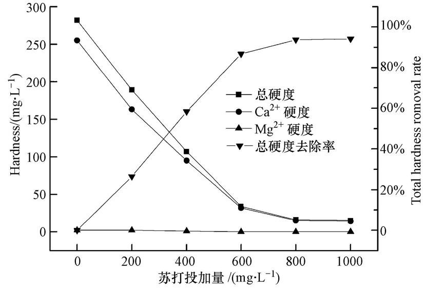 4)150 mg · L-1的石灰投加量和800 mg · L-1的蘇打投加量可以將廢水的硬度降低至17.5 mg · L-1以下,出水滿足印染回用水要求.