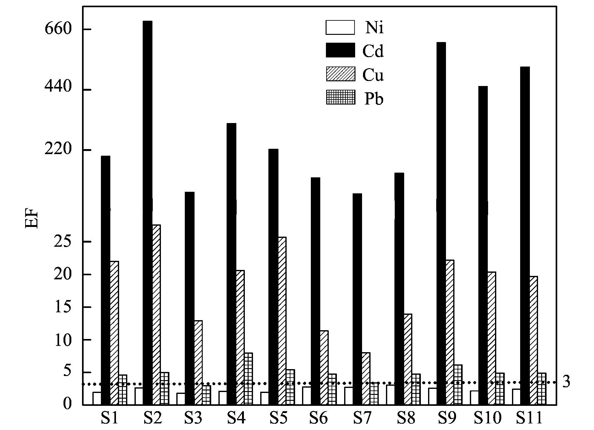 采用重金屬實(shí)測(cè)值與工業(yè)化以前長(zhǎng)江系沉積物中重金屬的平均含量的比值即富集系數(shù)(EF)來(lái)判斷沉積物中重金屬元素的富集程度及人為影響狀況.各采樣點(diǎn)重金屬的富集系數(shù)如圖 3所示.沉積物中各重金屬富集系數(shù)大小順序?yàn)镃d(308.51)>Cu(18.58)>Pb(4.97)>Ni(2.38).已有研究指出, 若EF大于3, 屬于嚴(yán)重污染等級(jí).除所有采樣點(diǎn)中Ni的EF值小于3和S3點(diǎn)位中Pb的EF值(2.94) 接近3外, 各采樣點(diǎn)沉積物中重金屬的EF值均大于3, 存在重度富集現(xiàn)象; 尤其是Cd累積比較為典型, 其EF值介于60.88~688.76, 在研究區(qū)沉積物中的含量變化范圍為15.22~172.19 mg·kg-1, 是比較主要的污染貢獻(xiàn)元素, 表明大冶湖沉積物Cd重度污染除受大冶湖流域內(nèi)過度施用農(nóng)藥和化肥等農(nóng)業(yè)活動(dòng)輸入影響外, 很大程度上受有色金屬冶煉、化肥使用及礦山開采等活動(dòng)廢水排放的影響.