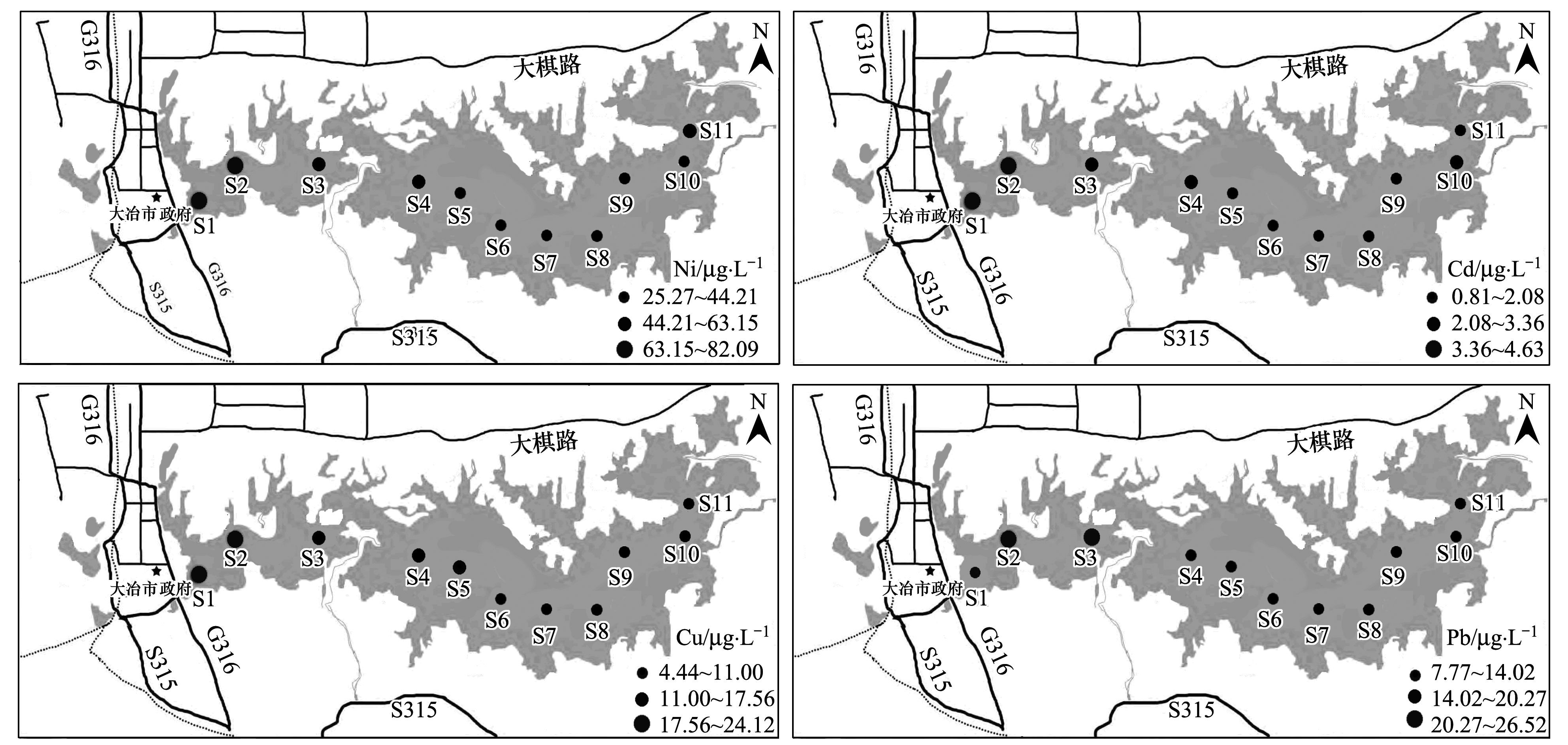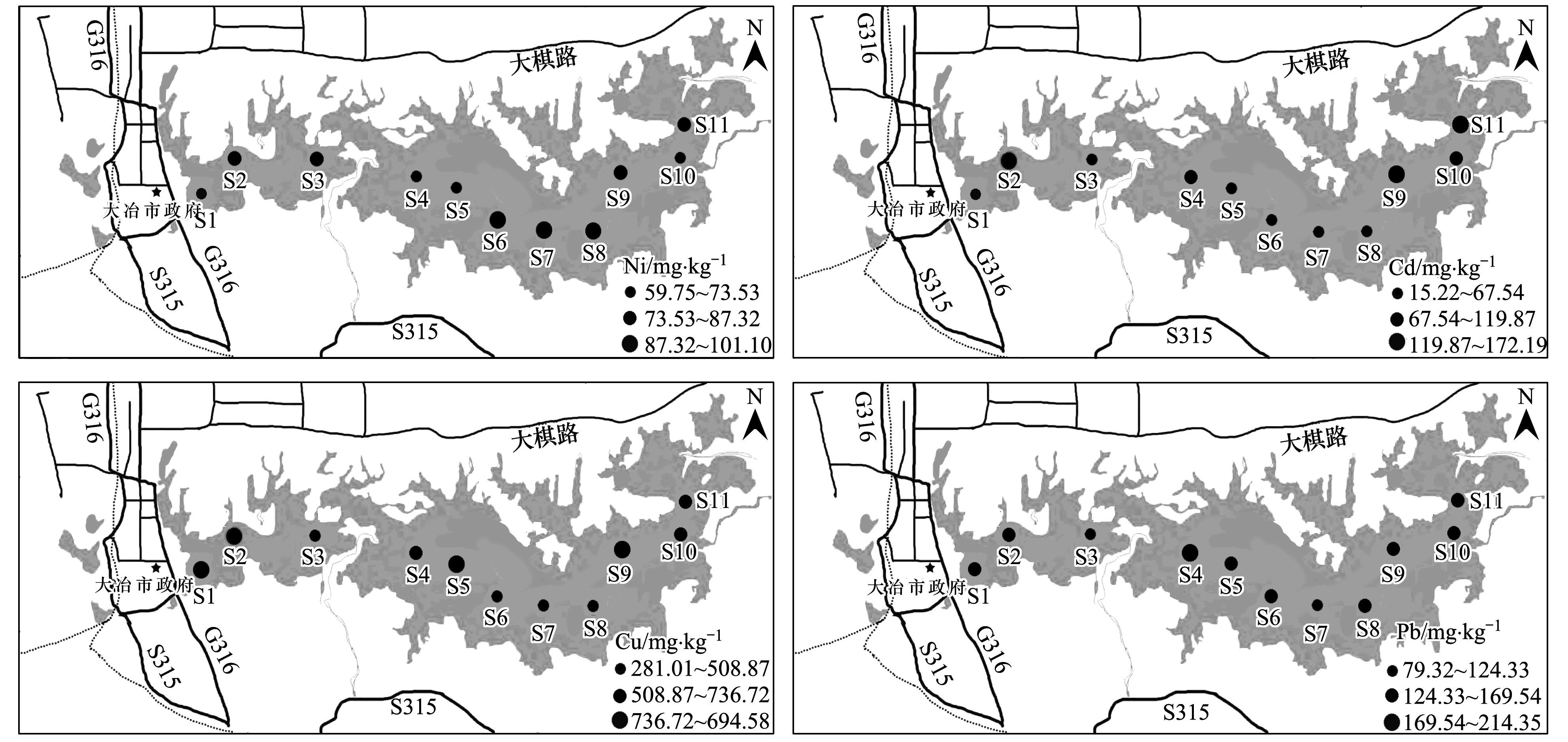 重金屬(Ni、Cd、Pb和Cu)元素污染分布特征表現(xiàn)為:大冶湖表層水和沉積物中重金屬元素污染主要分布在市政污水和工業(yè)廢水排污口較集中的湖灣區(qū)域, 而中部重金屬污染總體趨勢(shì)一致; 究其原因, 大冶湖湖灣(S1、S2和S11) 周邊分散著多家大型國(guó)有高污染礦冶企業(yè)以及大量“五小”(小選礦、小洗礦、小冶煉、小紅磚、小化工)企業(yè).此外, 大冶湖流域植被覆蓋率低, 山體裸露, 地質(zhì)災(zāi)害時(shí)有發(fā)生, 水域面積不斷縮小, 人口數(shù)量不斷增加, 同樣也會(huì)直接導(dǎo)致大冶湖湖灣處重金屬污染更為嚴(yán)重.由于大冶湖是半封閉的水體, 流動(dòng)性及與其他水體交換能力低; 大量重金屬污染物主要以懸浮物的形式, 通過各種途徑進(jìn)入湖泊水體后, 隨著水流的搬運(yùn)以及重力沉降作用, 比較終遷移至湖泊沉積物中, 導(dǎo)致大冶湖中部水體重金屬分布較均勻.