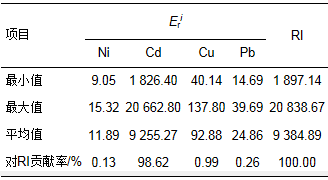 式中, RI為潛在生態(tài)危害指數(shù); Eri為單個(gè)重金屬的潛在生態(tài)危害系數(shù); Tri為重金屬i的毒性系數(shù); Ni、Cd、Cu和Pb毒性系數(shù)Tri分別為5.0、30.0、5.0、5.0; Cfi為重金屬的富集系數(shù)(Cfi=Csi/Cni); Csi為重金屬i的實(shí)測(cè)含量; Cni為計(jì)算所需的參照值, 本研究以長(zhǎng)江沉積物化學(xué)元素背景值作為參比值; Ni、Cd、Cu、Pb的參比值分別為33.00、0.25、35.00、27.00mg·kg-1.