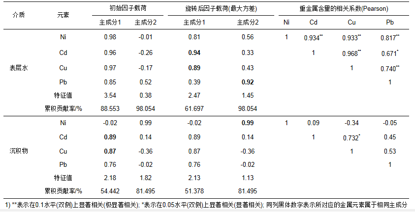 表 2 表層水和沉積物中重金屬含量的相關(guān)系數(shù)、主成分及成分矩陣