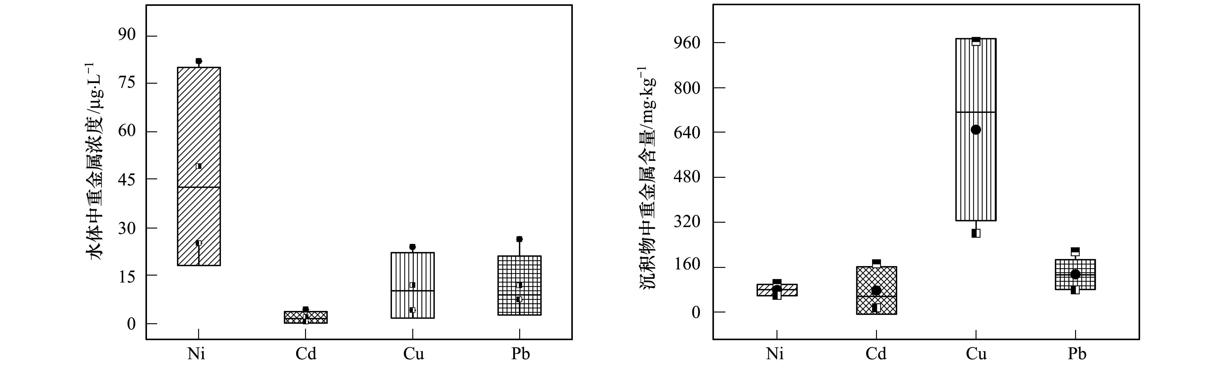 水樣帶回實(shí)驗(yàn)室后, 通過“王水+雙氧水”加熱濃縮, 經(jīng)過濾并測(cè)其重金屬含量.沉積物樣品置于通風(fēng)處自然風(fēng)干后, 經(jīng)碾碎、剔除雜質(zhì)、研磨、篩分等前期處理操作, 用傳統(tǒng)的封閉式混合酸(HCl-HNO3-HF-HClO4)法高溫消解后, 使用火焰原子吸收分光光度計(jì)(美國(guó)Varian AA240) 測(cè)定樣品中重金屬污染元素Ni、Cd、Cu和Pb.在實(shí)驗(yàn)過程中供試試劑均為優(yōu)級(jí)純, 所用器皿均用王水浸泡24 h以上.同時(shí), 質(zhì)量保證采用三平行樣和加標(biāo)回收法; 其中, 樣品分析數(shù)據(jù)的標(biāo)準(zhǔn)偏差(RSD)均在10%以內(nèi); 對(duì)國(guó)家土壤成分分析標(biāo)準(zhǔn)物質(zhì)(GSS-3、GSS-5) 進(jìn)行回收率分析時(shí), 各元素回收率在86%~115%之間.所有數(shù)據(jù)均基于Excel 2013、SPSS 22.0和Origin 9.0等軟件進(jìn)行統(tǒng)計(jì)分析.