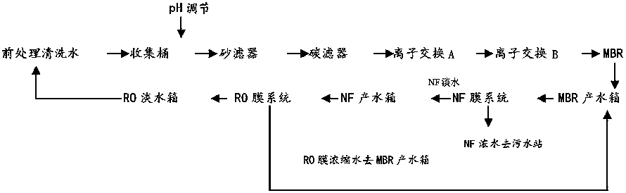 本發明的電鍍前處理廢水在線回用工藝將離子交換與MBR膜系統、NF膜系統、RO膜系統技術相結合,可實現廢水的循環使用,減少了新鮮水用量,達到減排的目的,在生產上的實際運用的效果可以節省新鮮用水85%,更加環保,推廣價值較高。