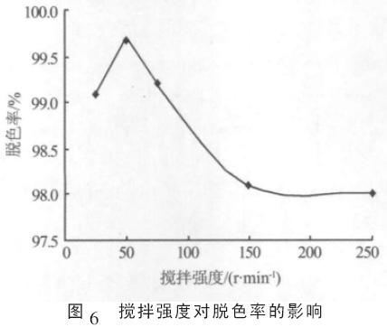 由圖6 可知,攪拌強(qiáng)度較小時,脫色率較高,攪拌強(qiáng)度在50 r/min 左右時,脫色效果比較好,攪拌強(qiáng)度超過150 r/min,脫色率明顯下降。實驗中亦觀察到在慢攪情況下,形成的絮體較大,沉降較快;快攪情況下,形成的絮體較小,沉降較慢,這是因為水力條件對絮凝與凝聚行為影響很大。但攪拌速度太小,復(fù)合絮凝劑未能與污染物充分接觸, 自然會影響脫色效果;攪拌速度過大,絮體易被打碎,影響絮團(tuán)對污染物的架橋吸附及網(wǎng)捕作用,造成脫色率下降。具體參見污水寶商城資料或http://www.dowater.com更多相關(guān)技術(shù)文檔。