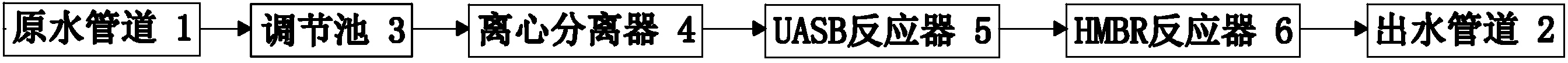 1.一種新型油田污水處理系統,其特征在于:包括調節池(3)、離心分離器(4)、UASB反應器(5)和HMBR反應器(6),調節池(3)的入水口與原水管道(1)連通,調節池(3)的出水口與離心分離器(4)的入水口連接,離心分離器(4)的出水口與出水管道(2)連通,在離心分離器(4)與出水管道(2)之間設置有UASB反應器(5)和HMBR反應器(6)。