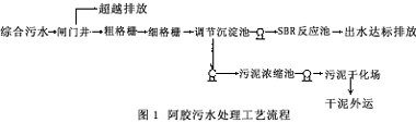 山東省某阿膠廠是福膠集團設于平陰縣東阿鎮的老廠,主要生產傳統阿膠及阿膠保健品的原料—清膠,生產過程排放的污水中污染物主要有驢毛、驢皮碎塊等不溶物和溶解性、膠狀蛋折質等有機污物,具有濃度較大、有機物含量高、可生化性好等特點,直接排放將嚴重污染環境。該廠污水治理被列為濟南市重點污染限期治理項目。該污水治理工程采用調節+SBR法污水處理工藝,經過1個半月的調試運行后通過監測驗收。監測結果表明該工藝設計合理、處理效果良好、出水穩定,出水水質符合GB8979--1996《國家污水綜合排放標準》的二級排放標準。
