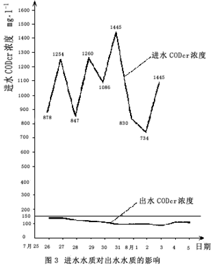 調試運行完畢,CODcr濃度的變化對本工藝出水水質的影響甚微,無論進水的CODcr突然升高或降低,出水的CODcr值變化不大,能保證出水CODcr值在100mg/1左右,低于國標要求的150mg/1。如圖3所示。