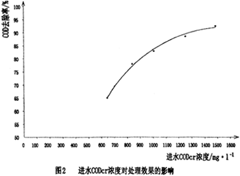 原水的CODcr變化幅度較大,比較高值在3446mg/1,比較小值是839mg/1。說明該處理工藝耐沖擊負荷能力強,即對進水水質急劇變化引起的沖擊負荷的適應能力強。CODcr的去除率在一定范圍內會隨進水CODcr濃度的提高而增長,如圖2所示。然而濃度過高,超過微生物的耐受能力時,將導致處理效果的降低。
