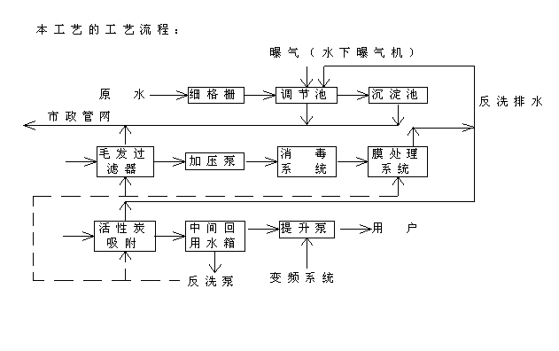 方案簡介: 1. 細格柵:自己制作為細網狀或直接向廠家定做 2. 調節池一般設計為1.5-2.0h的水力停留時間,并向其內曝氣(為了減輕調節池發生厭氧反應而產生的異味),一般采用水下曝氣機。池底設有放空管,池頂設有溢流孔。 3. 沉淀池一般設計為0.5-0.8h的水力停留時間,池子以斗形為宜,池底設有放空管或設良好量較小的排污泵亦可,池頂設有溢流孔,調節池與沉淀池的污水經過地下排污溝排到排污池經排污泵排入市政管網。 4. 毛發過濾器,以小孔徑的毛發過濾器為宜,截留原水中的毛發等大的顆粒物,為保護后續膜設備而設,其自設反洗管管路【水處理設備】,可設計為每天反洗一次,每次10分鐘。 5. 加壓泵為一備一用而設(本工藝采用流量為16m3/h,揚程80m,功率5.5Kw,南方泵業CDL16-100)為后續系統增壓而設。 6. 消毒設備(本工藝消毒設備為專利技術,市場很難買到,其主要作用是去除原水中的有害微生物、細菌等對人體有害菌)可采用臭氧強氧化劑。 7. 膜處理系統,主要采用中空纖維膜(本工藝中采用8根Φ200的中空纖維膜,其進水流量維持在12 m3/h,出水維持在10 m3/h左右,本系統原設計為每天反洗一次,但實際運行2個月后,效果不理想,改為每小時反洗10分鐘,保護中空纖維膜),以后設計在前期設計的水要經過十分精細的過濾,這樣不會使膜堵塞,保持系統的正常運行。其運行壓力為0.1-0.3MPa。 8. 活性炭吸附,由膜出來的水經過活性炭吸附,去臭、去味還可吸附水中的膠體物質(如果活性炭吸附系統前置在膜系統之前則1公斤活性炭處理水量8-12噸,活性炭的壽命會很短,很快更換活性炭,而其后置則為前置的20倍左右,提高活性炭的使用壽命,活性炭后置脫氯1公斤活性炭處理水量30噸左右,做直飲水時亦如此)本工藝活性炭罐設計為每天反洗一次,每次10分鐘,罐體設計為Φ1600,有效高度為2000,凈高2800,實際裝填量為75%。 9. 中水回用池設計為3小時的水力停留時間,在中水回用池底設有放空管,頂部設有溢流孔,中水回用池上部設有自來水補給管道。 10. 提升泵,本工藝供給4座辦公樓沖廁用水,有高層和低層,故選用南方泵業型號為CDL4-60與CDL4-140(立式泵)并選用CDL4-140一臺做為前面的幾個系統的反洗泵。 電器控制部分: 電器控制部分可分為控制加壓泵運行、提升泵運行以及反洗幾個方面。 ① 加壓泵受沉淀池和中水回用池內的液位控制器來控制:<1>.若沉淀池內水位達到設計要求而回用池內水位較低,加壓泵運行;若沉淀池內水位未達到設計水位,回用池內水位較低,加壓泵不運行,自來水補給閥門打開。<2>.沉淀池內水位未達到設計要求,而回用池內水位達到設計要求,加壓泵不運行;沉淀池內水位未達到設計要求,而回用池內水位達到設計要求,加壓泵不運行。 ② 提升泵受各樓中水水箱內的液位控制器的控制以及中水回用池內液位控制器的控制:<1>.中水回用池內處于低水位時,提升泵不運行;<2>.中水回用池內水位達到設計要求,各樓中水水箱內水位處于高水位時,提升泵不運行,處于低水位時,提升泵運行。 、 反洗方面,在系統正常工作時,毛發過濾器、膜系統以及活性炭系統的正常出水的電磁閥打開,反洗電磁閥關閉,每天設定的反洗程序啟動,毛發過濾器、膜系統以及活性炭系統的正常出水的電磁閥關閉打開:<1>.首先是活性炭罐的反洗閥門打開,進行反洗;<2>.其次是膜系統的反洗閥門打開,進行反洗;<3>.比較后是毛發過濾器的反洗閥門打開進行反洗。 、 排污坑內設一液位器,來排掉從調節池、沉淀池、回用池以及從毛發過濾器內排出的污水。 本工藝較傳統的活性污泥法相比較優點在: 1. 出水水質明顯優于活性污泥法的出水水質; 2. 占地面積小,比活性污泥法的占地面積節省50%以上; 3. 運行簡單,基本可實現無人職守; 4. 不受溫度、水量的變化; 5. 設備結構緊湊,可根據實際情況連續運行,易維護。 本工藝易產生的現象是運行時膜系統易堵塞,要求前期水質較好。