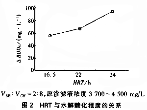 混合廢水經(jīng)ABR處理后,其BOD5/COD比值明顯提高,當(dāng)進(jìn)水BOD5/COD較低時(shí),效果更為顯著。如進(jìn)水為0.665時(shí),出水達(dá)0.68,進(jìn)水為0.2~0.3時(shí),出水可提高至0.4~0.6。ABR對(duì)出水BOD5/COD的改善,無(wú)疑可促進(jìn)混合廢水好氧處理的效果和運(yùn)行穩(wěn)定性。 BOD5/COD的提高反映了ABR反應(yīng)器良好的水解酸化作用。研究表明,對(duì)不同的混合比、原滲濾液濃度、HRT,ABR反應(yīng)器可獲得不同程度的水解酸化作用。原滲濾液濃度和混合比較低時(shí),產(chǎn)甲烷作用較弱,表觀水解程度與實(shí)際水解程度接近;當(dāng)原滲濾液濃度和混合比較高時(shí),甲烷發(fā)酵加強(qiáng),表觀水解酸化度與實(shí)際情況差別較大。研究還發(fā)現(xiàn),當(dāng)原滲濾液濃度及混合比均較低時(shí),水解酸化作用與HRT呈正相關(guān)(見(jiàn)圖2,其中ΔBOD5表示進(jìn)出水濃度之差)。