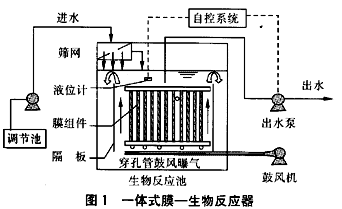 一體式膜—生物反應器處理醫院污水的工程設備的內部構造見圖1,設計處理能力為20m3/d。