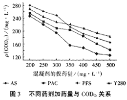 分析混凝實(shí)驗(yàn)結(jié)果圖1和圖2可知,在Y280的加藥量為400mg/L時(shí)色度能達(dá)標(biāo),CODcr達(dá)標(biāo)的Y280加藥量為520mg/L,達(dá)標(biāo)時(shí)Y280對(duì)這種廢水的CODcr去除率為40%,色度去除率為75%。在Y280的投加量為1000mg/L時(shí)可出現(xiàn)比較好的水處理效果,此時(shí)CODcr去除率達(dá)80%以上;色度去除率可達(dá)90%以上。 2.2 Y280與常用混凝劑的用量比較 硫酸鋁(AS),聚合氯化鋁(PAC),聚合硫酸鐵(PFS)是常用的混凝劑,為了進(jìn)一步了解Y280的水處理性能,將其與AS,PAC,PFS進(jìn)行對(duì)比。所有對(duì)比實(shí)驗(yàn)在相同的條件下進(jìn)行,用CODcr達(dá)標(biāo)時(shí)各藥劑投加量作為對(duì)比依據(jù)。實(shí)驗(yàn)結(jié)果見(jiàn)圖3。從圖3分析可知,AS的達(dá)標(biāo)投加量為450mg/L,PAC的達(dá)標(biāo)投加量為430mg/L,PFS的達(dá)標(biāo)投加量為330mg/L。結(jié)合Y280的實(shí)驗(yàn)結(jié)果可看出,在CODcr達(dá)標(biāo)時(shí),Y280的用量分別是AS,PAC,PFS用量的1.15倍,1.21倍和1.58倍。
