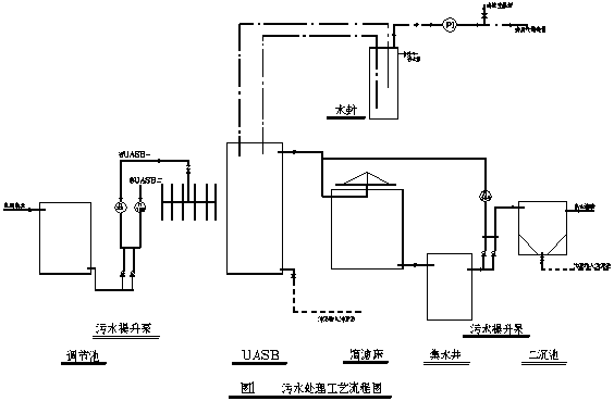 采用厭氧(UASB)——好氧(滴濾床)工藝對該廢水進行處理,其工藝流程見圖1。