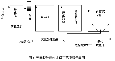 由于苧麻脫膠廢水中含有大量天然色素,經(jīng)過生化和物化處理后,色度的去除仍不理想,因此在工藝設(shè)計(jì)中增加氧化池,即加入氧化劑氧化這些天然色素,使大部分有色有機(jī)物能迅速分解,使廢水經(jīng)處理后能穩(wěn)定達(dá)標(biāo)排放。