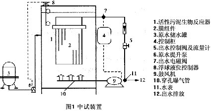 本研究擬檢驗(yàn)國(guó)產(chǎn)膜的可應(yīng)用性,同時(shí)省去傳統(tǒng)的出水抽吸泵[2],采用位差驅(qū)動(dòng)出水,省去復(fù)雜的氣或水反沖洗設(shè)備,低水頭間斷工作,盡量降低曝氣量和動(dòng)力消耗,以使開發(fā)的設(shè)備盡快投入實(shí)際應(yīng)用。
