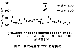 運(yùn)行期間進(jìn)水COD的平均值為366.4 mg/L,比較大值為780.9 mg/L,比較小值為228.0 mg/L。出水COD的平均值為13.1mg/L,比較大值為25.2mg/L,比較小值為4.4mg/L,COD的平均去除率為96.0%;沖擊負(fù)荷對(duì)出水COD去除沒有影響,這說明系統(tǒng)的穩(wěn)定性和可靠性。試驗(yàn)結(jié)果如圖2所示。