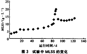 從運(yùn)行結(jié)果看,國(guó)產(chǎn)膜分離性能良好,運(yùn)行過程中無剩余污泥排放,MLSS變化如圖3所示。