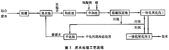 物化法和生化法聯(lián)合使用是處理印染廢水常規(guī)的典型工藝[1];炷恋砭哂忻撋腿コ龖腋∥锬芰姷奶攸c,同時所投加的混凝劑也可以起到一定的調(diào)節(jié)pH作用。生化法對溶解性的有機物去除能力強。在本工程中,由于廢水中的主要污染物在pH為6~9條件下為難溶性的對苯二甲酸和各種分散染料等,因此綜合廢水先經(jīng)混凝沉淀,可有效地去除有機污染物、色度和調(diào)節(jié)pH值,并提高廢水的生化性能,為后續(xù)生化處理創(chuàng)造有利條件。生化法采用 氧化溝工藝,適用于該印染廢水水質(zhì)特點和對出水水質(zhì)高的要求。? 廢水處理工藝流程詳見圖1。