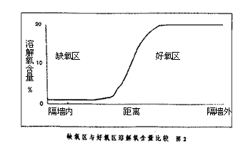 OCO工藝的一個主要特點(diǎn)是:好氧區(qū)與缺氧區(qū)之間的污水交換,即內(nèi)回流不需泵送,以上兩個區(qū)域之間有一段是相通的。兩者之間的交換形式及量的大小是依靠攪拌器的控【水處理技術(shù)】制來實(shí)施,因此節(jié)省能耗。當(dāng)攪拌器運(yùn)轉(zhuǎn)時,湍流增強(qiáng),好氧區(qū)與缺氧區(qū)混合程度增強(qiáng),當(dāng)攪拌器停止運(yùn)轉(zhuǎn)時,兩區(qū)之間的混合程度較低。此時測得的溶氧狀況如圖2所示,好氧區(qū)與缺氧區(qū)的區(qū)分很明顯。OCO反應(yīng)池的構(gòu)造和攪拌器的循環(huán)工作可保證好氧區(qū)和缺氧區(qū)之間很高的回流比,這種頻繁的變化是該工藝有效脫氮的關(guān)鍵之一。