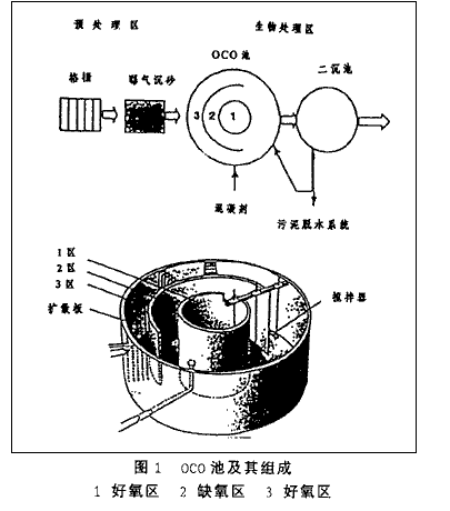 OCO-得名于生物處理裝置的幾何形狀。OCO池呈圓形,里圈、外圈隔墻為圓形、中圈為半圓形。其工作原理如圖1所示。