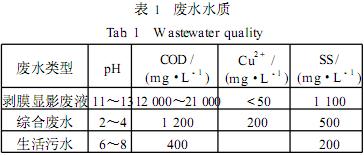 廣東省某印刷電路板廠在生產過程中排放的廢水種類復雜,根據水質特點進行分類收集,廢水水量為:剝膜顯影廢液為150m3/d,生活污水量為300m3/d,綜合廢水量為1500m3/d。廢水水質見表1。