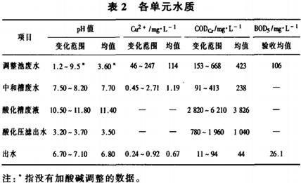 該系統調試運行10個月來,電化學部分運行正常,中和槽廢水清澈透明、水質穩定;接觸氧化池里曝氣系統良好,生物掛膜量不大,產生的污泥較少,出水穩定。該工程于2003年5月竣工,8月順利通過【水處理設備】驗收,各處理單元的出水水質見表2。
