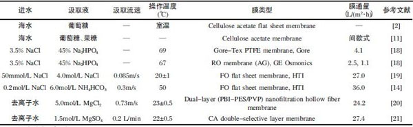 比較早關(guān)于應(yīng)用正滲透技術(shù)處理工業(yè)廢水的可行性研究報道發(fā)表于1974 年[26]和1977 年[27],其目的是使用這種低能耗的過程處理微重金屬污染的工業(yè)廢水。他們采用序批式系統(tǒng),以商業(yè)化的醋酸纖維RO膜為膜單元,以合成海水為汲取液,來濃縮含低濃度銅或鉻離子的水,具有一定的可行性。但由于膜通量非常低(0~4.5L/(m2·h)),鹽的截留率也不太理想,沒有開展進一步的研究。