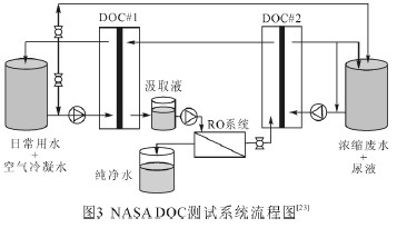 空間站和星際旅行都需要對水進行處理和循環(huán)利用。太空任務(wù)中可回收的水源有日常用水,尿液和空氣水分。美國宇航局(NASA)聯(lián)合Osmotek 公司開發(fā)了直接滲透濃縮系統(tǒng),即DOC 系統(tǒng)用于太空任務(wù)中的水處理和循環(huán)利用[22-23]。比較初的DOC 測試系統(tǒng)處理流程如圖3 所示,包括一個反滲透處理系統(tǒng)和2 個DOC 預(yù)處理子系統(tǒng),一個是正滲透過程、另一個是正滲透與膜蒸餾結(jié)合過程(用于分離尿素和尿酸類物質(zhì)),采用氯化鈉驅(qū)動溶液將廢水濃縮后,利用反滲透從稀釋的汲取液中分離得到純凈水。