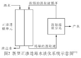 從表1 可以看出,所有的應(yīng)用還只停留實驗室規(guī)模,早期的膜存在通量小的問題,而采用HTI 公司的膜和新研制的膜可以達到較高的膜通量。這些研究表明,采用正滲透技術(shù)進行海水淡化在技術(shù)上是可行的。需要著重說明的是,近四年來,美國耶魯大學(xué)的Elimelech 課題組在這方面做了許多有意義的研究探索[10, 13-16]。他們采用HTI 公司商品化的正滲透膜和NH4HCO3 汲取液,通過柱蒸餾或膜蒸餾的方法進行汲取液的濃縮,工藝流程如圖2 所示。結(jié)果表明,鹽截留高于95%,水通量大于25L/(m2·h),整個FO 過程電能消耗為0.25kWh/m3,低于目前脫鹽技術(shù)的電能消耗,顯示出很好的應(yīng)用前景。目前他們已開發(fā)了中試規(guī)模的裝置用于海水淡化[17]。這些研究極大推動了正滲透技術(shù)在海水淡化中的應(yīng)用進程。