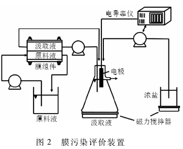 實驗使用的MF膜為聚偏氟乙烯( polyvinylidene fluoride , PVDF)材質的平板膜,其平均孔徑為0. 2 um。 FO膜為HTI公司生產的TFC材質的平板膜。所用FO膜為非對稱膜,分為活性層和支撐層,且已有研究表明膜污染物更易于在支撐層沉積,因此本實驗所采用的膜的朝向為“活性層朝向原料液”。FO膜和MF膜元件的有效面積分別為0. 057 m2和0. 060 m2。MF膜的通量控制在(11士1)LM H。