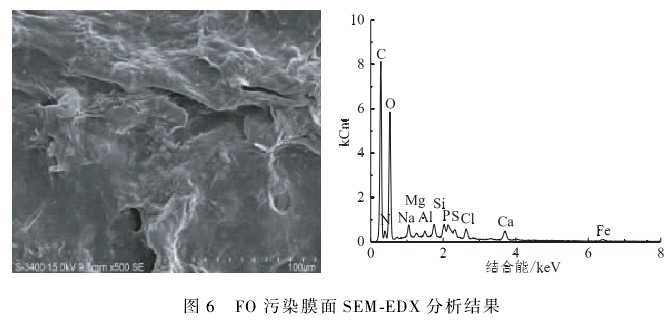 SEM結果表示,膜面全部被污染物覆蓋,呈不規則形狀。EDX結果顯示,污染膜的成分包括C、N、O、Na、Mg、AI、Si、P、S、CI、Ca和Fe等離子,其中無機污染離子主要為Na、Si、P、S、CI、Ca和Fe,其次為Mg和Al。在MFO-MBR運行過程中,進水和活性污泥中都存在這些金屬離子,因此,進水和活性污泥為無機污染的主要來源,這與已有研究結果相似。